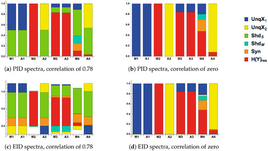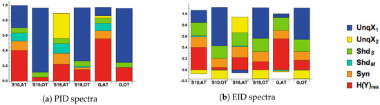 It could be argued, however, that is part of the output semantics in the sense that the output contains information specifically about itself. Since is clearly positive for these values of it is impossible to know whether or not this is the case based on this classical Shannon measure. It was shown in [8], that could be decomposed into two terms: the unique information that conveys about Y as well as synergistic information that is not available from alone, but rather gives the information that and , acting jointly, have about the output Y. We now apply information decompositions in order to resolve these different interpretations. For discussion of some limitations of classical Shannon measures and the need for new measures of information, see [20].
