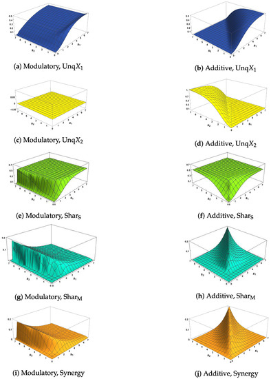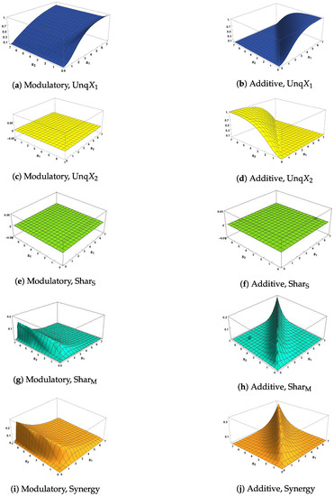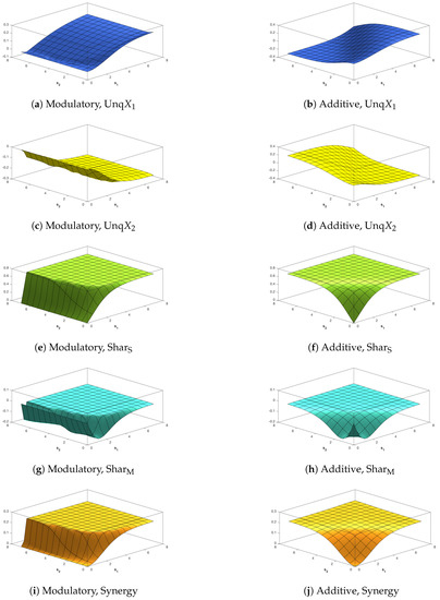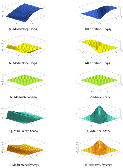 Figure 2e,g and Figure 3e,g show, when is close to zero, that and are both close to zero, thus supporting condition M2 when the modulatory transfer function is used. This is not the case when the additive transfer function is employed, as can be seen from Figure 2f,h and Figure 3f,h. It is important to note that these figures do not all use the same scales for the heights of the surface. For example, the scales of Figure 2e and Figure 3e are expanded because is always small when the transfer function is modulatory.