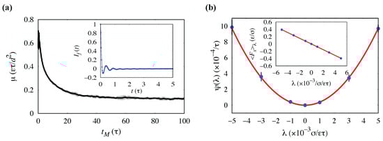 First, we compute using the Green–Kubo formula in Equation (21). Note that other elements of the stress tensor can be averaged over to achieve better statistics. In both the Green–Kubo method and the new proposed calculation, the statistical benefit would be identical, so for notational clarity we will consider only the component. We average the stress autocorrelation function over 20 ns, and this function is shown in Figure 1a. The time correlation function is oscillatory due to the inertial recoil of the dense fluid, and has largely decayed within 1 ps, though there is a slow component to the decay from the approximate conservation of momentum for times shorter than the timescale for the Langevin thermostat. From Green–Kubo theory, the viscosity is the integral of this function. Shown in the main part of Figure 1a, is as a function of the upper limit of the integral as in Equation (9), which has plateaued by ps. Also shown are the associated statistical errors, which grow with . The calculated shear viscosity from five independent simulations and a cutoff time of 20 ns is ·. This value is in good agreement with that previously reported [59].