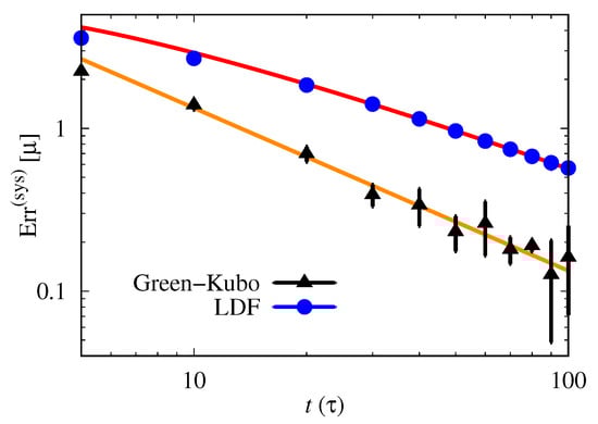 Relative systematic error due to finite time in the estimation of in the Green–Kubo method (black) and the large deviation function (LDF) method (blue). The time, t, in the x-axis denotes the upper limit of the integral, , in the Green–Kubo method, or the total length of the trajectory, , in computing the large deviation function. The red line is a fit to the function , and the orange line is a fit to .