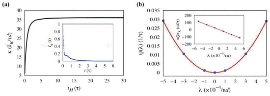 Within Green–Kubo theory, the thermal conductivity can be computed by integrating the autocorrelation function of the x component of the heat flux, , as in Equation (25). The inset of Figure 4a is the decay of the autocorrelation function, which comprises a fast decay from the high-frequency vibrational modes, followed by a slower decay that contributes most to the thermal conductivity and arises due to the low frequency acoustic modes [69]. To compute from the integral, as shown in the main part of Figure 4a, the upper time limit is chosen as , though the relaxation of the correlation extends only to around 5. To compute from the large deviation function, we study fluctuations in the time averaged heat flux, , defined in Equation (26). The transport coefficient, , is again calculated using Equation (10) by assuming the large deviation function as a parabola, which is justified in Figure 4b. The inset there shows clearly the linear response of the biased ensemble average, , computed from Equation (12). Given sufficient statistics the two methods converge to the same value. The estimate of thermal conductivity from the Green–Kubo method using a long trajectory of is , while the estimate from the large deviation function using walkers and is .