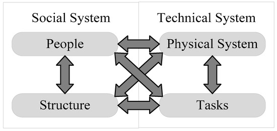 The complexity analysis of systems is currently a widespread theme. It reflects system features such as comprehensibility, modifiability, uncertainty, or maintainability. These features are especially important during design optimization (e.g., information systems). There are a number of complexity measures that have been defined in a number of areas such as physics, biology, sociology, and others. A brief overview of complexity measures can be found in [1]. In the field of complex systems, exist the so-called phase transitions that change the structural and behavioural properties of the system, and thus its complexity. These changes represent, for example, the change of the information system, change of the top management, etc. The complexity of a system is generally dependent on the degree of its tension that invokes the occurrence of phase transitions and the related qualitative properties, such as efficiency, productivity, sustainability, or adaptability. One of the most widespread examples of complex systems is socio-technical systems that deal with human interaction with technical systems. One of the largest challenges in socio-technical systems is creating an appropriate environment in which the entities show maximum performance without requiring explicit management [2] or that require minimal management. Higher performances of the entities can be achieved through effective management (motivation, reward, tasks, etc.) or with a suitable environment (an environment in which the entities are implicitly motivated towards greater performance—self-imposed tension). An example could be a reward/motivation system for employees in a company, the structure of a workspace, or the flexible system of working hours. Various models for optimal performance are suitable for different types of systems, for example, creative work vs. administrative work. Figure 1 illustrates the general structure of a socio-technical system. Examples of socio-technical systems are workspaces, information systems, organizations, and work teams.
