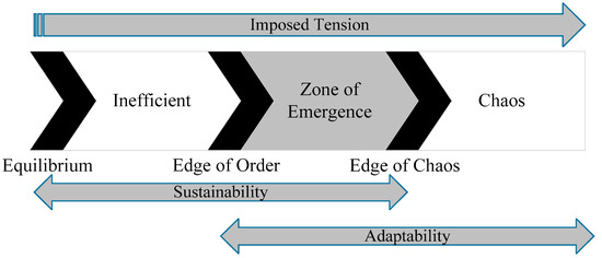 The edge of chaos (the second critical value) represents a situation in which a system is no longer capable of dissolving the imposed tension and becomes unusable (e.g., the abovementioned example of the fuel boiler). The system is fading into chaos at this critical point. Between the first and second critical values is the so-called zone of emergence (also called the melting zone), in which the imposed tension initiates an adaptive process, which leads to improved structural and behavioural properties of the system. The region of emergence should be as broad as possible, because the elements of the system have greater space for adaptation (dissipation of the imposed tension). If the system is unable to dissipate the imposed tension, its behaviour becomes chaotic, i.e., the system ceases to fulfil the function for which it was designed. Prigogine and Stengers [10] found that if the energy exchange is balanced and sufficiently intense, a surprising phenomenon occurs, i.e., the system goes to a higher level of complexity. The characteristics of this transition are a crisis of energy exchanges and the random effects of the chaos from the peripheral parts. The system attains new properties, structure, and development. This finding means that all that is known about the system is no longer valid.