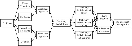 The proposed approach is based on a series of steps that lead first from the modelling of a real system/process with Petri nets, through mapping the Petri net model to a Markov chain and the calculation of the stationary probabilities, to the quantification of the fractal (information) dimension and the Hurst exponent. The following section presents the procedure for the quantification of the abovementioned characteristics together with the restrictions that limit this approach.