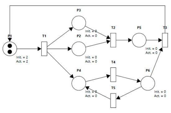 Petri nets are a useful tool for the modelling and analysis of behavioural and structural properties of discrete event dynamic systems. Petri nets were first developed by Carl Adam Petri [38], who sparked their continuous development to the present. Petri nets have been developed for many application, which has led to their specialization for modelling and analysis of specific systems and issues. One of the routes pursuing the development of Petri nets was the definition of new structural and behavioural characteristics that allow for verifying specific properties of the modelled system. Examples of properties that are verified on Petri nets can be liveness, boundedness, reachability, and fairness [39]. Verification of individual properties is usually analytical (for basic classes of Petri nets, e.g., Place Transition Petri nets and Stochastic Petri nets) or based on simulation (for higher classes of Petri nets, e.g., Coloured Petri nets). The other development path has followed the expansion of the basic definition of Petri nets in such a way that their modelling power meets specific requirements. An example would be timed and stochastic Petri nets, which allow for improving the individual state changes by reference to time complexity—deterministically [40,41] or stochastically [42]. Other examples are coloured Petri nets [43,44], which combine Petri nets with another modelling language and thus significantly widen (and mainly simplify) the modelling capabilities of the Petri nets. The main disadvantage of this second path is the fact that the verification options are limited since most of the assumptions (properties) must be determined by using simulation.