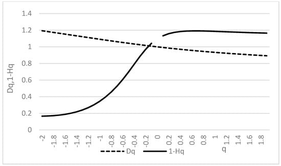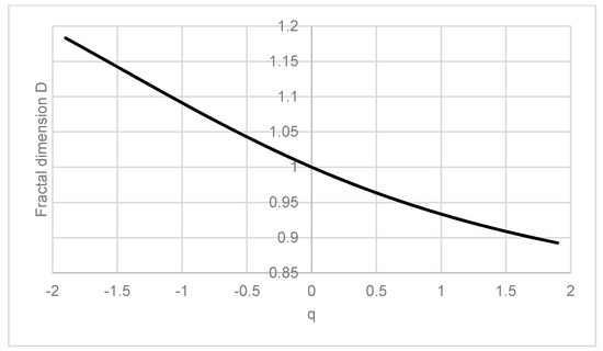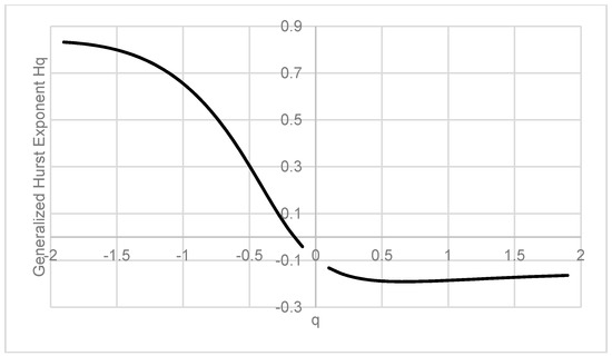 Figure 6 shows the development of the generalized Hurst exponent depending on the constant (the Hurst exponent is not defined for , see Equation (10)).