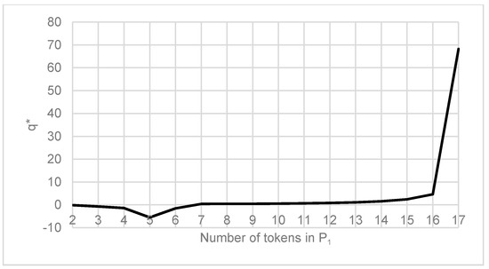 Next, it is possible to perform an analysis of the robustness in terms of self-similarity. Figure 8 shows the evolution of the equilibrium when changing the number of tokens at . The plot contains all of the situations for which the value of was found. In other cases, i.e., if , there are no signs of self-similarity in the model (the equality does not hold, for all ).