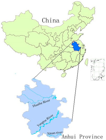 Anhui Province, located in the east of China’s mainland (Figure 1), is a total area of 1.396 × 105 square kilometers, accounting for about 1.45% of the area of China. The main rivers in Anhui Province are the Yangtze river, Huaihe river and Xin’An river, as well as one of the five largest freshwater lakes, Chaohu lake. It belongs to the transition zone between the warm temperate zone and the subtropical zone, whose climate is warm and humid, and the monsoon climate is obvious. The annual average temperature is about 14–17 °C and the relative humidity is about 70–80%. The distribution of precipitation in time and space is uneven. The precipitation in the south is more than in the north and the precipitation in mountain areas is more than in plain and hilly areas. The variation of annual precipitation is great (Figure 2) and under the influence of the monsoon climate; the precipitation in summer is abundant and accounts for 40–60% of the total annual precipitation. In addition, the monthly precipitation also changes greatly, which often leads to drought and flood disasters. The Northern droughts often appear in spring and summer, while the droughts south of the Huaihe river often appear in summer and autumn. Floods occur mostly in the Huaihe river basin and secondarily, in the Yangtze river basin.