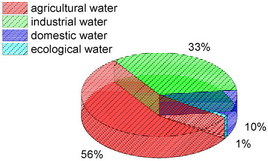 The annual water consumption in Anhui Province varied from 20 to 30 billion cubic meters in 2005–2015, which included a rapid growth trend from 2005–2009, but tended to be stable after 2010 (Figure 4). The structure of water consumption is shown in Figure 5. Agricultural water accounted for about 56% of total water consumption and industrial water, domestic water and ecological water accounted for 33%, 10% and 1%, respectively.
