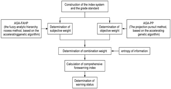 - In this model, for the determination of the weight of each index, the forewarning index system and the grade standards of water resources carrying capacity were established, according to the actual situation of the study area. AGA-FAHP was used to calculate the subjective weight of each index. AGA-PP was used to calculate the objective weight of each index. In addition, the minimum relative information entropy principle was used to calculate the combination weights. Then, the forewarning comprehensive index was calculated to find out the relationship between the forewarning comprehensive index and the membership degree of “non-warning”. On this basis, the forewarning model of the regional water resources carrying capacity was established. This model combined expert experience and objective information in the research area. In addition, the calculation results were reasonable. This can be used in other forewarning systems by modifying the index system and grade standards for its universality.