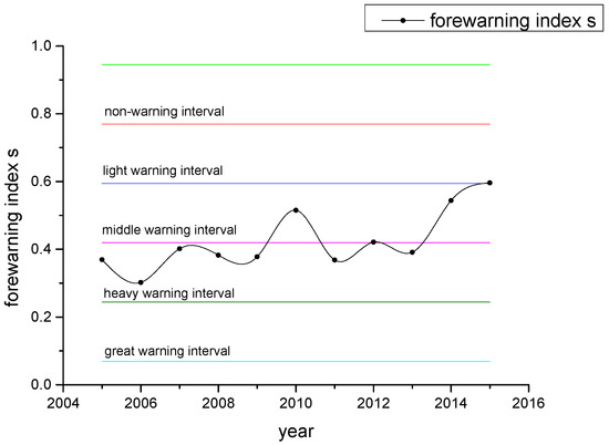 According to the previous introduction, we know that when the “non-warning” membership degree is f(i) ∈ [0.8, 0.1], it means that the forewarning state of the water resources carrying capacity in that year is non-warning. As shown in Table 3, the interval of the comprehensive forewarning index corresponding to the non-warning interval is [0.7697, 0.9449]. Similarly, when s(i) belongs to [0.5945, 0.7697], [0.4193, 0.5945], [0.2441, 0.4193], [0.0689, 0.2441], the corresponding warning status of the water resources carrying capacity is light warning status, middle warning status, heavy warning status, and great warning status, respectively. Taking 2005 as an example, the comprehensive forewarning index of 2005 which is equal to 0.3694 belongs to [0.2441, 0.4193]. This means that the warning status of the water resources carrying capacity in 2005 is a heavy warning status. Similarly, the warning status of the water resources carrying capacity over the years 2006–2015 can be obtained (Table 3).