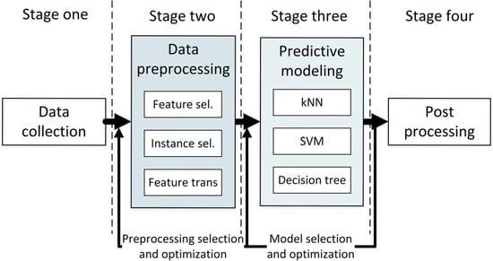 The data mining process consists of four stages, which are: (1) data collection; (2) data preprocessing (of all data transformation elements, for example feature normalization, instance or feature selection [1], discretization [2], and type conversion); (3) prediction model construction (e.g., k-nearest neighbors (kNN), decision trees, and kernel methods) [3]; and finally (4) data postprocessing (see Figure 1). In real applications, when an accurate model is needed the process requires a search for the best combination among the elements available in stages (2) and (3). This significantly increases the computational complexity (we have to find the combination of preprocessing elements which best supports given prediction model) thus causing a rise in the expenses of building the prediction system and a longer computational time.