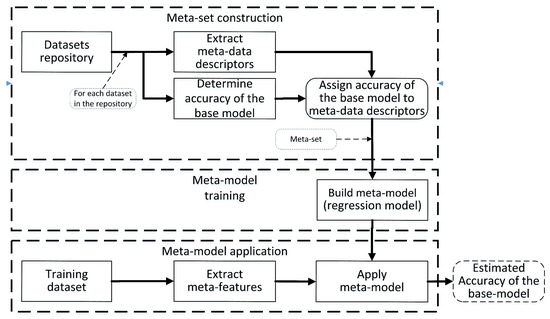 There are several solutions to this problem (for example [4]), but one of the most robust solutions is meta-learning [5], which is designed to accelerate stage (3). It is based on representing the training set, which consists of n feature vectors by a single meta-date instance, and then uses it as an input to the meta-model which returns the estimate of the accuracy without training the actual (base) model [6]. The obtained values for different base models are ranked from the best to the worst and only the best model with the highest estimated accuracy is finally trained on the entire training set.