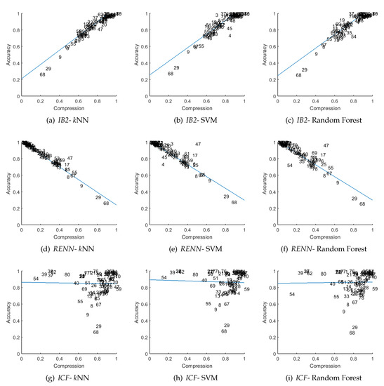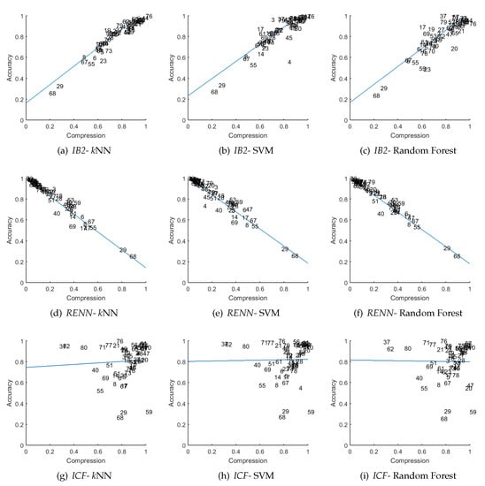Again, the obtained results indicate a significant relationship between compression and accuracy, but not in all of the cases, as in Case A. The strongest relationship was observed for the same methods, which are: CNN, IB2, ENN, RENN, and All-kNN. The other methods have also similar values; only the correlation sign of ICF changed, but this may be a result of numerical artifacts because the value is also close to 0. The plots are also presented for RENN, IB2, and ICF to make them comparable to the previous results. Obtained results are shown in Figure 5, where each row represents an individual instance selection algorithm, columns represent different classifiers, and the blue line in each plot is the linear regression model.