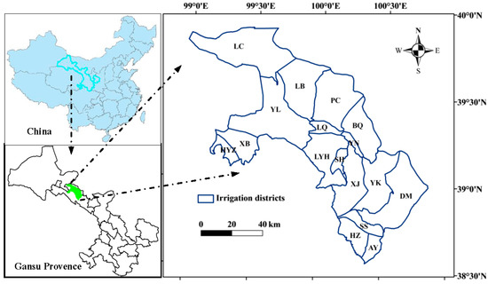 The study area is the middle reaches of the Heihe River basin (98°30′–101° E, 38°30′–40° N), lying in an arid region of Gansu Provence, northwest of China, and covers an area of 11,427 km2. The Heihe River basin is the second largest inland river basin in China. In this region, crop production mainly depends on agricultural irrigation, because the mean annual precipitation and evaporation are about 117 mm and 1065 mm, respectively. Water consumption from agricultural irrigation accounts for approximately 90% of the total water consumption in this region [38]. Therefore, the optimal distribution of limited irrigation water and land resources is a key factor for agricultural development and sustainability [4,39]. The study area presents a higher terrain in the southeast and low in the northwest, and the elevation is between 1235 m and 3634 m. there is heterogeneity of biophysical and soil condition in this region. The content of organic matter and nitrogen is higher in the southern part than in the northern part [19]. The middle reaches of Heihe River basin is a commodity grain production base, which is made up of 17 irrigation districts (as shown in Figure 1). The main crops in this region are maize, potato, seed maize, cotton, oil crops, and vegetable. Therefore, planting crops in a suitable region, as well as integration between the quantity structure optimization and spatial allocation optimization, are of primary importance to agricultural production management [40].