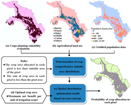 Based on the spatial distribution of crop suitability, spatial distribution of population density, and agricultural land use data, the spatial distribution optimization model based on cross entropy, subject to the constraints of optimal crop area obtained from agricultural cropping pattern optimization model, is used to determine the optimal spatial distribution of crops.