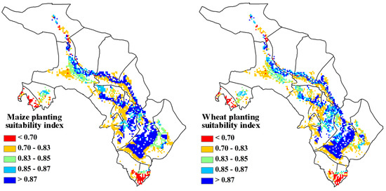 The suitability of crop cultivation in this study is referenced from Peng [19]. Based on the ecological niche fitness theory, Peng [19] selected climatic and environment factors (rainfall, temperature, ET0), soil characteristics (organic matter, total nitrogen, total phosphorus, total potassium, pH, bulk density), and geographical factors (terrain elevation, slope and aspect). These factors are closely related to crop growth and are used for evaluating the ecological niche and crop planting suitability. Figure 3 shows the spatial distribution of crop planting suitability index. Owing to the limitation of data collection, Peng’s [19] study on the maize and wheat planting suitability was employed.