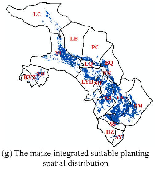 Results show that the maize comprehensive suitable planting spatial distribution is consistent with the current maize planting spatial distribution. The suitable area mainly focuses on the east of the YL irrigation district, the north of the LYH irrigation district, and most areas of the XJ, YK, DM irrigation districts. However, there are fewer areas suitable for growing maize in HYZ, HZ, and LQ.