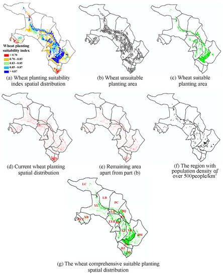 Principle 3: According to [18], when the population density exceeds 500 people/km2, it would be unsuitable for crop growing area. The land would be urban with little agriculture. Combined with the spatial distribution of population density, the region with population density over 500 people/km2 (part f in Figure 4) is deducted from the suitable planting area.