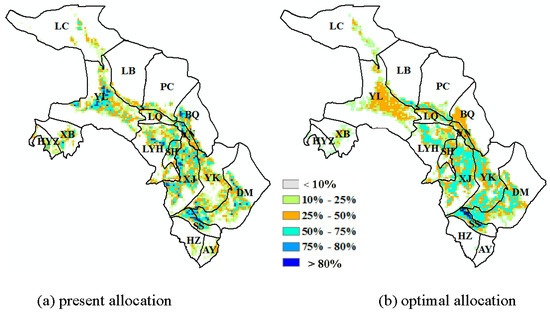 Comparison of maize area spatial distribution between present and optimal allocations is shown in Figure 7. Results show that after optimization, it tends to centralize grids, and the proportion of maize area in each grid is greater than 80% in the south of study area. This mainly focuses on the SS irrigation district, as the suitable area for planting maize in SS irrigation approaches the optimized area needed to be allocated.