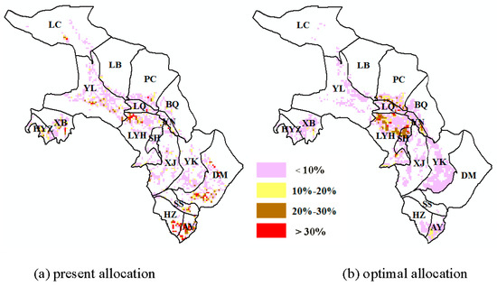 Meanwhile, the optimal spatial distribution shows more centralization than before optimization, because of the number of grids with a proportion of 50–75% increase, while the amount of grids with a proportion of 10–20% and less than a 10% decrease.
