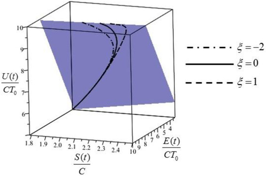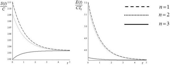 Notice that the values of are constrained on the plane and all three values exponentially evolve towards a value of 0. A plot of these quantities for three different values of the parameter is given in Figure 1. The initial energy, equal for the three different initial states, is given by since we arbitrarily set . The evolution of the temperature is obtained by the standard Fourier methods. The plots in Figure 1 are obtained directly from Equations (28)–(30) for a Biot number equal to 1.