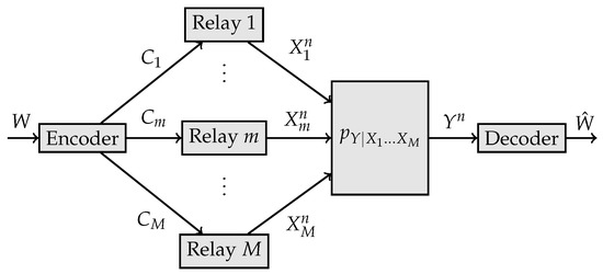 Each relay m, , maps its description into a sequence , which is sent over a multiple access channel. The MAC is characterized by the input alphabets , the output alphabet and the transitional probabilities for all . From the received sequence , the sink decodes an estimate of W.