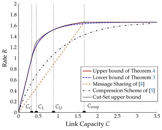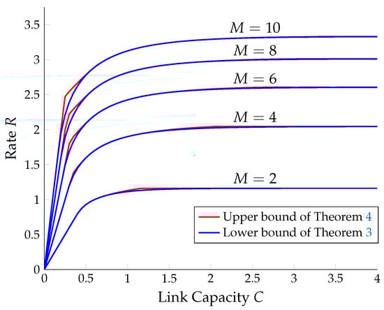 The upper bound of Theorem 4 and the lower bound of Theorem 3 are plotted in Figure 2 for and , and they are compared with the lower bounds of message sharing [] and compression []. One sees that our lower and upper bounds are close, and they match over a wide range of C. Moreover, establishing partial cooperation among the relays through Marton’s coding offers significant gains. Figure 3 plots the capacity bounds for and different values of M.