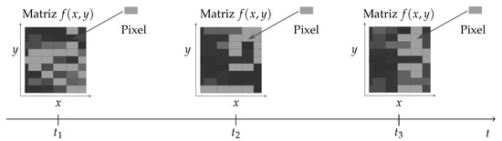 A fairly common example of stochastic environments are videos. Consider the following scenario: A video with n frames, where there are w pixels with color information for each video frame present in the image that compose it. These pixels can be considered as samples of a given X random variable that evolves over time. Thus, this scenario gives us a data source of the X random variable at each time slot, which allows us to estimate different measures of information for each slot, and IP among those measures. Figure 2 presents a schematic for this scenario, where video frames represent the random variables in a stochastic process.