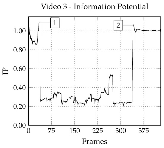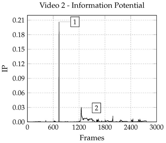 An important fact to notice is the presence of peaks in IP values at some points in the video. This is justified by a dramatic change in color pattern presented throughout the video. In Figure 8, two points were highlighted because they present a substantial change in the information potential. Point 1 is located in frame 735, where a small sequence of almost black frames occurs, while point 2 is located in frame 1250 and also presents a sequence of video frames darker than the average.