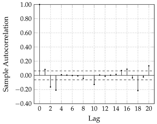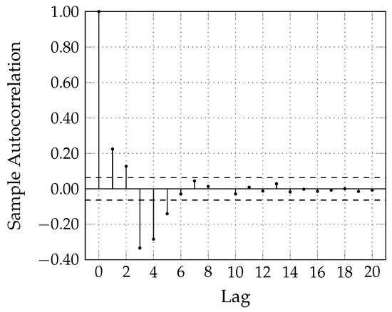 Analyzes of the error autocorrelation function (e) were carried out, in order to evaluate the model suitability to the systems tested. The network error (e) is the difference between the output estimated by the NARX network () and its real value (). According to [28], the autocorrelation function measures the correlation between and , where and is a stochastic process. The definition of autocorrelation for lag l is given by