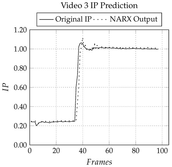 The initial procedure of the simulations consisted in obtaining a sequence with the IPs of each frame of the video. The calculation of the IP was performed per Equation (7). From there, it became necessary to use some technique capable of finding the existing dynamics in the data. There are many techniques for this purpose, depending on the system characteristics. In this initial modeling, we chose to make the identification and prediction of the systems through a NARX-NN (Nonlinear Autoregressive with Exogenous Inputs Neural Network). The NARX-NN model is a recurrent dynamic network that is commonly used in time-series modeling. The analogy between the ARIMA model and the NARX-NN model is clear as both models use previous samples of the output signal and previous values of an independent input signal to compute its output [] [27]. Equation (8) presents the definition for the NARX-NN model:
