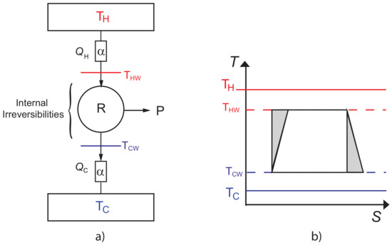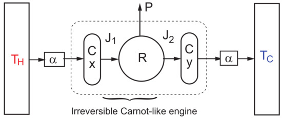 In the past 40 years, a branch of thermodynamics called finite-time thermodynamics (FTT) has been developed, based mainly on the pioneering work of Curzon and Ahlborn (CA) [1], although Novikov and Chambadal [2,3] had previously reported an equivalent analysis. CA formulated an engine with a modified Carnot cycle and proposed the so-called endoreversible hypothesis [4]. Its assignment has been applied for the analysis of several thermal heat engine models [5,6]. This hypothesis assumes that all irreversibilities in a thermal engine can be described only by the couplings between the working fluid and its environment, allowing the working substance to carry out reversible inner cycles. A more realistic case, which is therefore important to consider, is to include in the model both external and internal dissipations, since the internal dissipations also influence the performance of a thermal engine. Such irreversibilities are of major importance and some authors [7,8,9] have made contributions to the thermodynamic analysis of the CA engine. They proposed equivalent approaches for irreversible finite time thermodynamics, avoiding the endoreversible hypothesis defining a parameter R; all internal irreversibilities are included and when , the endoreversible model is recovered. In the context of FTT, several objective functions have been proposed. CA performed the analysis considering the maximum power output, and subsequently other criteria were presented. One of the criteria is the function known as ecological, introduced by Angulo–Brown [10]. For this criterion the value to maximize is a function that represents a trade-off between high power output and low entropy production defined as , where P represents the power output, the entropy production, and the cold thermal reservoir.