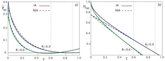 The behavior of the optimized thermodynamic functions in this regime is shown in Figure 3. The power, as shown through Equations (5) and (7), is plotted for and in Figure 3a. As can be seen, the values for the power are practically the same in both the cases with IA and with NIA. This is a consequence of the fact that expression (7) with NIA has been obtained under an approximation. It can also be observed that a decrease of the parameter R, that is, an increase of the internal irreversibilities, causes a decrease of the power, as expected. A difference with the maximum power regime is that, in this case, the values of are more restricted, as , otherwise the power is negative. Figure 3b shows the behavior of optimal efficiency; it is greater when no instantaneous adiabats are considered. In the same way for greater internal irreversibilities, when R is lower, the efficiencies decrease. In summary, the CA engine with internal irreversibilities has a better thermodynamical performance when considering instantaneous adiabatic branches.