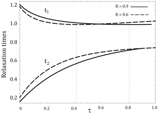 From the dynamic non-linear Equations (24) and (25), we followed a well-known procedure to analyze the local stability of a system using the linearization technique [29]. The above provides us with information about the qualitative behavior of the phase portrait for the system near the fixed point. The Jacobian matrix J is determined and its eigenvalues, and , are found. Since both are negative real numbers this implies that the system steady state is a stable node and allows us to define the relaxation times as , . Figure 5 shows the behavior of relaxation times as functions of for two values of parameter R in the ME regime with NIA branches.