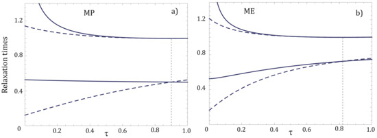 In this section we present a comparative analysis of the local dynamic stability for the CA engine model where internal irreversibilities are considered for both the instantaneous and non-instantaneous adiabatic branches case, operating with two regimes: maximum power, and maximum ecological function. Specifically, the relaxation time evolution derived from the linearization of the dynamic equations [23,25,27,29] are shown. Figure 7 shows the behavior of the relaxation times for the CA engine operating at maximum power (a) and maximum ecological function (b). Internal irreversibilities are considered since . The solid lines correspond to the case in which the instantaneous adiabats are taken and the dashed lines correspond to the case with non-instantaneous adiabats. From the plot it is observed that considering non-instantaneous adiabats reduces the relaxation times and therefore it can be considered that this increases the CA engine robustness.