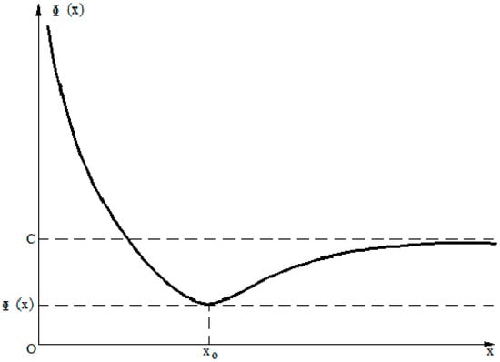 By integrating Equation (20) to obtain the difference function . The F(x) function in Equation (21) represents the cumulative probabilities for the standard normal distribution. When the above difference function is equal to zero, p(x) and q(x), which are described as two points in the (Ω, K) probability space, will coincide at the same point. When the difference function assumes a minimum value, this will indicate a point of transition between p(x) and q(x), where the two functions can be expressed in terms of each other. The same point also refers to a minimum number of observations required to produce information about the process X. When the difference function is described as in Figure 1, the presence of such a minimum value can be observed. The difference function Φ(x) decreases until x = x0, where it passes through a minimum value. At point x0, the two functions p(x) and q(x) approach each other until the distance between them is approximated by a constant C. After this point, when x approaches infinity, the difference function gradually increases; and finally, the difference between p(x) and q(x) approaches zero at infinity. One may define x0 as the point where the two probability functions can be used interchangeably with an optimum number of observations.