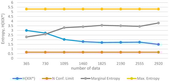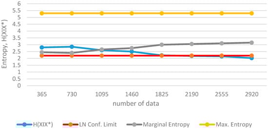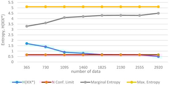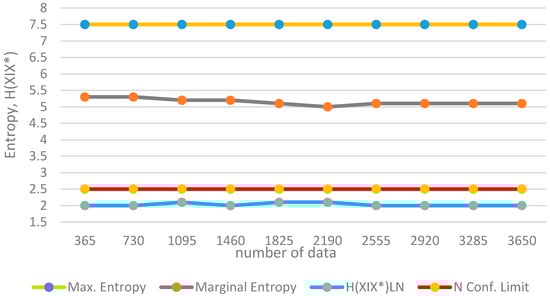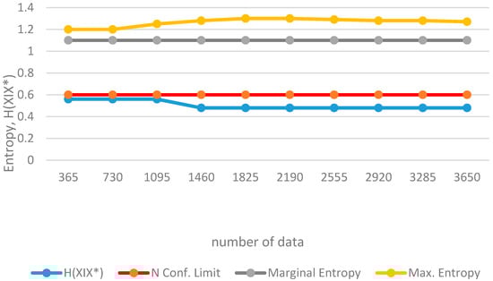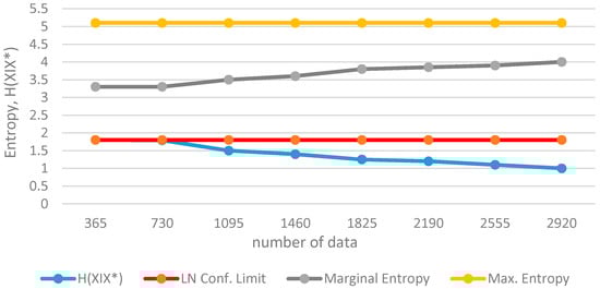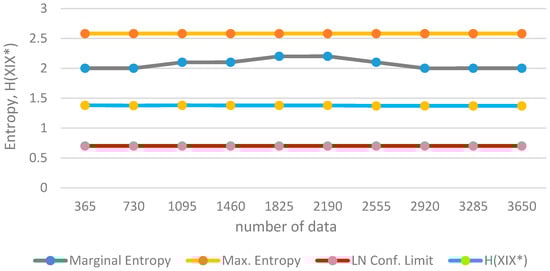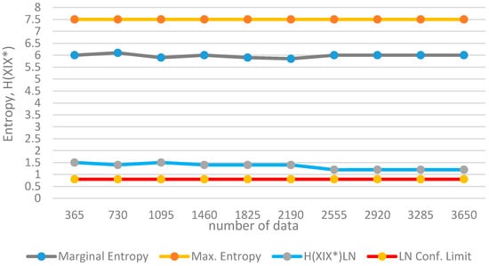 To test the methodology, N(8, 10) distributed 3650 synthetic data are divided into subgroups with 365 data in each. First, maximum informational entropy (Hmax) is determined, using Equation (31) and the whole time series. Assuming that the a posteriori distribution is normal, marginal entropies (H(X)) and, finally, the informational entropy values (H(X/X*) are computed for the normal distribution using Equation (15). Consecutive values of these entropy measures are computed first for 365 generated data, next for 2 × 365 data, and for the last year 10 × 365 data. The confidence limits for the case of a posteriori normal distribution is determined by Equation (38). Figure 4 shows the results of this application. If a lognormal posteriori distribution is assumed for this series, which is actually normally distributed, this assumption is rejected on the basis of the computed confidence limits for normal distribution. Otherwise, the assumption is accepted. In Figure 4, the H(X/X*) values fall below the confidence level determined for normal distribution so that the assumption of a posteriori lognormal distribution is rejected.