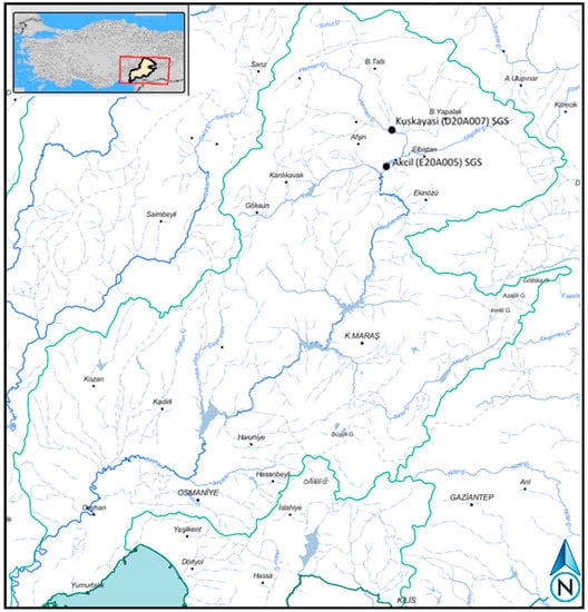 To test the above aspect of the entropy concept, observed runoff data at two monitoring stations (Kuskayasi and Akcil) in the Ceyhan river basin in Turkey are employed (Figure 8). The Ceyhan basin has been subject to several investigations and projects for the development of water schemes; thus, it is intended here to evaluate the monitoring activities in the basin in terms of entropy measures. Although there are other gauging stations along the river, their data are not homogeneous due to already-built hydraulic structures. Kuskayasi and Akcil are the two stations where natural flows are observed, although their common observation periods cover only 8 years.