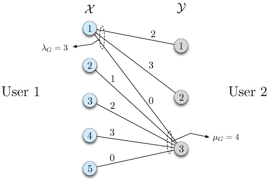 Figure 1. Bipartite graph representation of the probability distribution from Equation (17). Edge labels represent the function values f ( x , y ) = ( x + y ) mod 4 . Note that the maximum vertex degree is Δ X = 3 for x X and Δ Y = 5 for y Y whereas λ G = 3 and μ G = 4 .