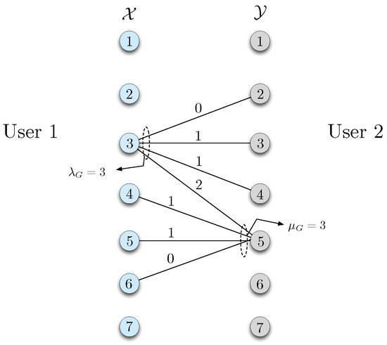 Figure 2. Shared bipartite graph with n = 1 . X = Y = { 1 , , 7 } representing the distribution p 2 ( x , y ) from Equation (20). Edge labels represent the function values f ( x , y ) defined in Equation (19). Maximum vertex degrees are Δ X = Δ Y = 4 for x X and y Y whereas λ G = μ G = 3 .