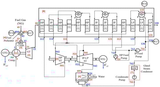 GateCycleTM energy-balance software developed by GE (Boston, MA, USA) was used to calculate the thermal properties at operating conditions with the pre-fixed malfunctioning component. The thermal properties at the design point at full load were provided by a power company. The performance of the power plant was evaluated in the ISO ambient conditions, namely, 288.15 K and 1.013 bar. The temperature at the combustor outlet was kept constant. The outlet temperature of the COM was kept approximately constant by controlling the mass flow rate of air and fuel. The isentropic efficiency of STs was calculated by using the Spencer, Cotton and Cannon method [29]. The inlet and outlet pressures of pumps (HP feed pump, IP feed pump, and condenser pump) were kept constant with slight variations in the mass flow rates. In all the cases, the net power generated at the power plant was kept approximately constant.