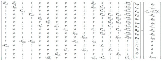 The matrix representation of the all cost-balance equations for the CCPP system is shown in Figure 2. Each row in the matrix represents the exergy-balance equation for a component or junction and the diagonal element indicates the principal product for each component. The exergy-balance equation for junction represents a “junction” for the specified exergy. On the other hand, each column in the matrix shows the manner in which an exergy produced in a component (diagonal element) is distributed to or consumed in other components (off diagonal elements). In this sense, the diagonal element in each column represents a “node” in the productive structure for the power plant. For example, the GT interacts with the AC through electricity and mechanical exergy. The thermal exergy produced in the COM and added in the FP () is consumed in the GT to produce electricity () and in the HRSG to increase the exergy of steam (). This implies that a fault that occurred in the GT affects the performance of the AC, COM, FP, and HRSG. The pressure exergy gained in the AC () is consumed in GT () and dissipated in COM () and HRSG (). The lost exergy recovered at the boundary (), which represents the total exergy lost in the system, is distributed among all components (). Subsequently, the total lost cost is allocated to all components in a manner proportional to the amount of the exergy lost. These examples indicate how the components in the plant are related with each other. Summation of all terms in column yields Equation (21), the overall cost-balance equation. As explained above, Figure 2 shows clearly the productive structure of the 300-MW CCPP.