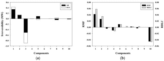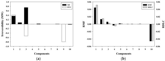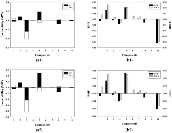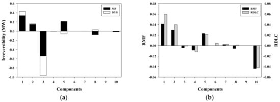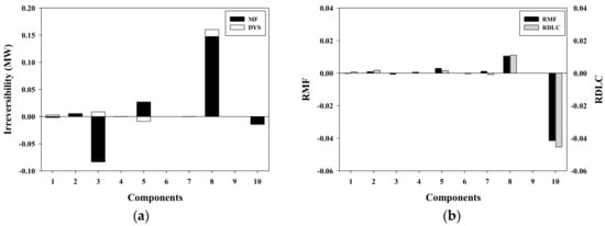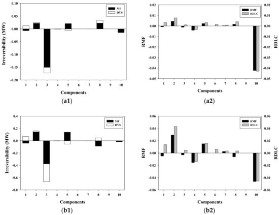 Distributions of MF and DYS (a) and RMF and RDLC (b) for components of the CCPP with the 0.5% degraded isentropic efficiency in the air compressor at 100% load condition.