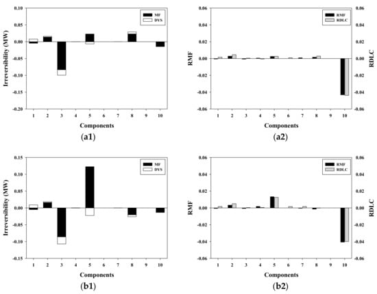 Table 7 lists the fuel and product exergies for each component at real operation and reference conditions, the ratio of the fuel to the product exergy, the values of MF, DYS, and RMF for the case of 0.5% degraded isentropic efficiency in the air compressor. The RMF value at the air AC approximately corresponds to 4.5%, and it significantly exceeds the values in other components. Hence it is easily identified as a faulty component. Even though the MF value at the COM is the highest among the components, its relative increase (RMF) is rater small. The distributions of the MF and DYS in each component are shown in Figure 3a and the RMF and RDLC are shown in Figure 3b. A significant increase in the lost cost flow rate or additional input cost flow rate occurs in the AC as clearly shown in Figure 3b. A relevant malfunction is accurately detected at the AC, and this indicates that the RMF and RDLC are potentially good indicators to identify the faulty components.