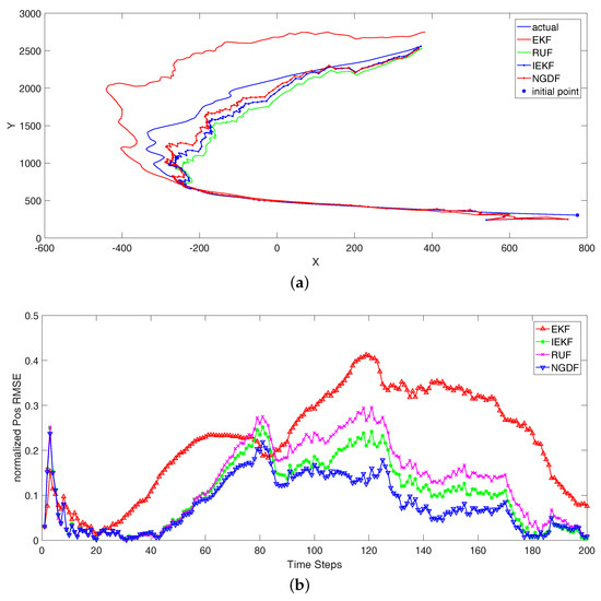 Firstly, we set the measurement noise variances as , and , and select a track as Figure 1a. We carry out 100 Monte Carlo runs for filtering, and average over different realizations to obtain the tracking and normalized position RMSE. In each Monte Carlo runs, the initial filtered state at time 0 is generated random according to the prior PDF. Usually, they are different. After filtering, the results are shown in Figure 1. In this figure, we can note that the different initial state has influenced the first few steps, and will perform well in the follow steps. In addition, the changeable trajectory can lead to the performance of tracking degradation. In this comparing experiment, we can know that the filtered track by our filtering method is closer to the true track than the other methods, and the normalized position RMSE of our method is lower than the others. Comparing the iterative filtering methods with EKF, the iterative methods have better performance. This is because that the iterative methods have utilized the more iterative steps to hold the nonlinear measurement function, and they are more accurate than the nonlinear processing in EKF methods.