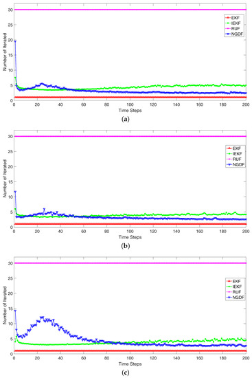 To measure the computational burden, we compare the number of iteration intuitively. The average number of iteration in each time step is shown in Figure 5. In the simulation, the EKF uses one step to obtain the filtered state in each time step, i.e., the iteration number is . The RUF is an iterative method, which has fixed iteration number as . For these three scenarios, the iteration number of the IEKF is about , while the iteration number of NGDF is roughly less than in Figure 5a,b. In Figure 5c, the number of iteration of NGDF is more than IEKF before the time steps 80, but lower in the succedent time steps. These results can reflect the computational burden. In each time step, the computational burden of RUF is 30 times than the EKF, while the IEKF is about 5 times and NGDF is less 4 times. Comparing the IEKF and NGDF method, the step-size of NGDF is adaptive, which leads to the less steps and more robust estimation. While the IEKF uses the full step-size, which may fluctuate or delay the stopping time. Besides, we compare the execution times in milliseconds for the Scenario 1. The four methods are implemented with the Matlab on a Intel Core i7 laptop. The average of the execution times based on the 100 monte carlo runs are: EKF (11.5 s), IEKF (38.4 s), NGDF (26.4 s) and RUF (187.6 s). In addition, it should be noted that these times are computed for the whole filtering procedure which achieve filtering from the beginning of time steps to the end. We can conclude that the lowest computational burden is achieved by our proposed method.