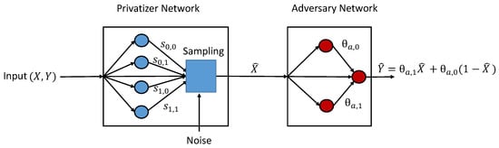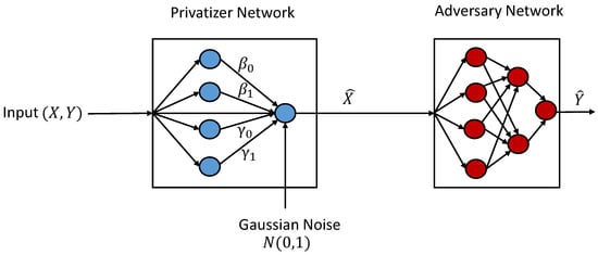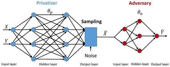 We investigate a setting where a data holder would like to publish a dataset in a privacy preserving fashion. Each row in contains both private variables (represented by Y) and public variables (represented by X). The goal of the data holder is to generate in a way such that: (a) is as good of a representation of X as possible; and (b) an adversary cannot use to reliably infer Y. To this end, we present GAP, a unified framework for context-aware privacy that includes existing information-theoretic privacy notions. Our formulation is inspired by GANs [68,69,70] and error probability games [71,72,73,74,75]. It includes two learning blocks: a privatizer, whose task is to output a sanitized version of the public variables (subject to some distortion constraints); and an adversary, whose task is to learn the private variables from the sanitized data. The privatizer and adversary achieve their goals by competing in a constrained minimax, zero-sum game. On the one hand, the privatizer (a conditional generative model) is designed to minimize the adversary’s performance in inferring Y reliably. On the other hand, the adversary (a classifier) seeks to find the best inference strategy that maximizes its performance. This generative adversarial framework is represented in Figure 2.