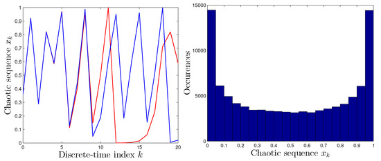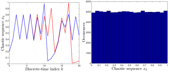 Right-hand panel: Occurrence histogram of the values of the states of the dynamical system (