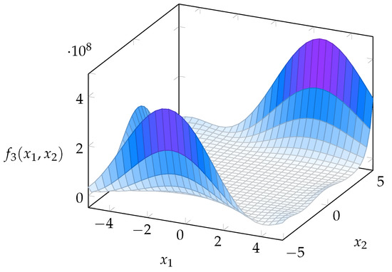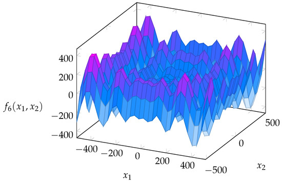 Rendering of the Schwefel function (benchmark function “F6”) for the case of independent variables.